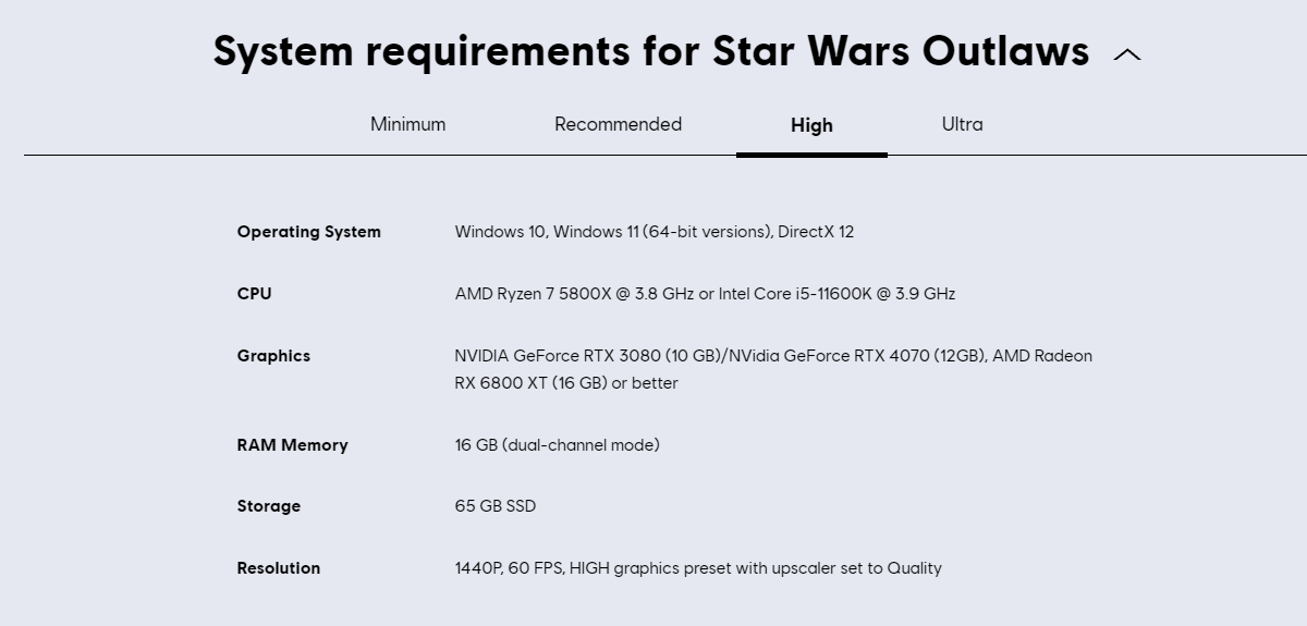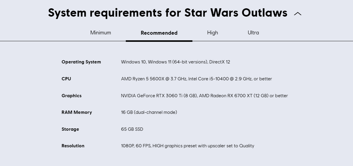 On the official Star Wars Outlaws website, Ubisoft revealed the recommended specifications to achieve 60 FPS at 1080p require a NVIDIA GeForce RTX 3060Ti or an AMD Radeon RX 6700 XT or better graphics card. The graphics preset will need to be set to “HIGH” with the upscaler set to Quality.