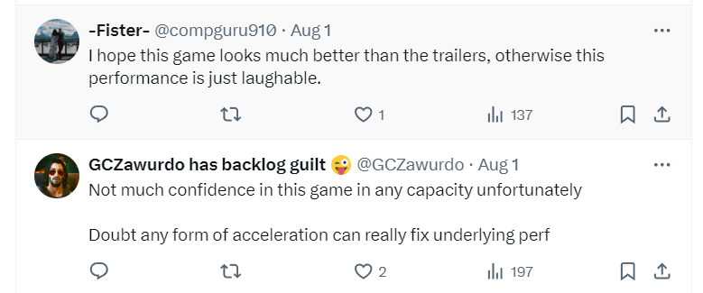 Another added, “Not much confidence in this game in any capacity unfortunately Doubt any form of acceleration can really fix underlying perf.”