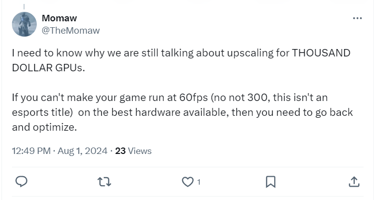 X user TheMomaw also stated, “I need to know why we are still talking about upscaling for THOUSAND DOLLAR GPUs. If you can’t make your game run at 60fps (no not 300, this isn’t an esports title) on the best hardware available, then you need to go back and optimize.”