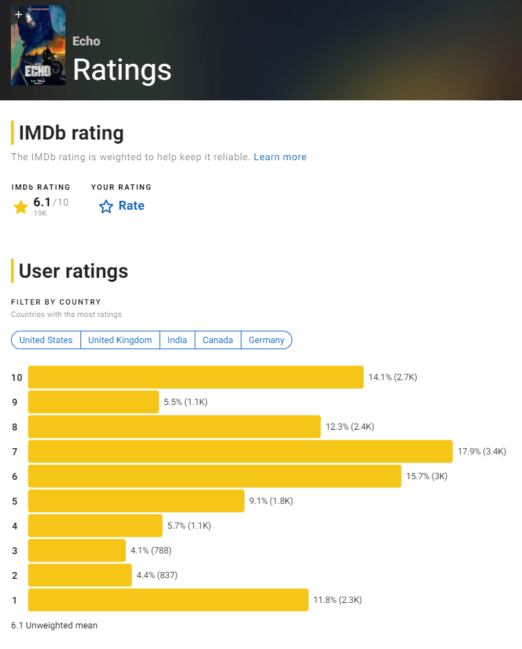 As far as Echo’s performance it has mediocre audience scores. On IMDb, the show currently has a 6.1 out of 10.