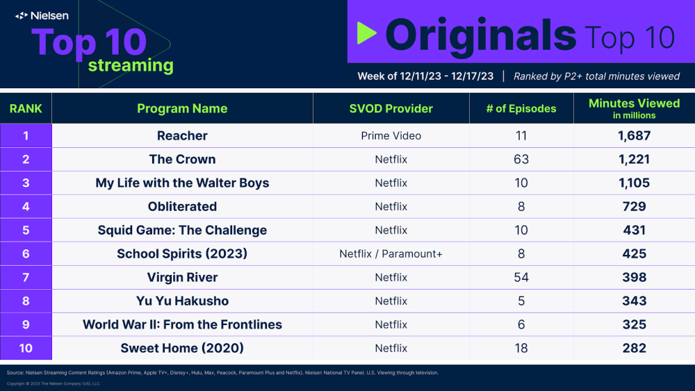 Nielsen Top 10 Originals chart for the Week of December 11, 2023 to December 17, 2023.