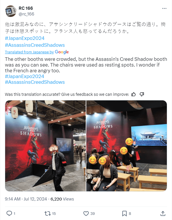 X user rc_166 shared photos from the convention on July 12th and commented, “The other booths were crowded, but the Assassin’s Creed Shadow booth was as you can see. The chairs were used as resting spots. I wonder if the French are angry too.”