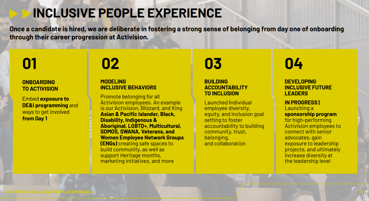 The same slide also details that the company has an “increased presence at events and organizations in addition to internships and apprenticeships to broaden the population of people who have access to opportunities at Activision over time (e.g., Lesbians Who Tech, LatinX Games Festival, National Society of Black Engineers).”