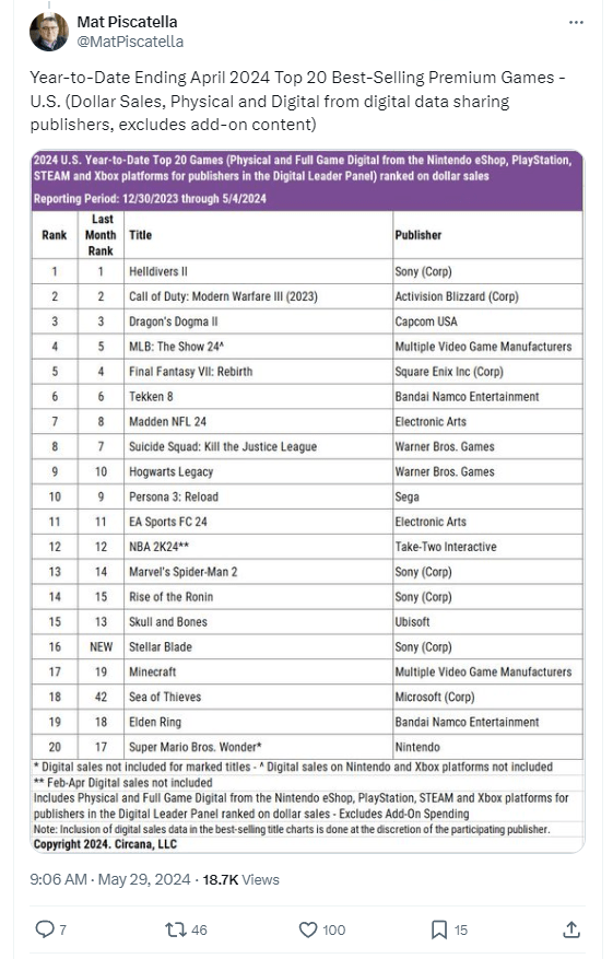 Not only did the game claim the top spot in the month of April, but it is already the 16th most sold game for the entire year. Helldivers II is the top selling game followed by Call of Duty: Modern Warfare III, Dragon’s Dogma II, MLB: The Show ’24, and Final Fantasy VII: Rebirth.