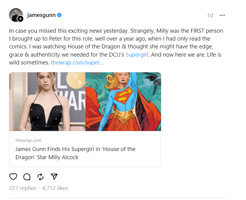 Gunn wrote on Threads, “In case you missed this exciting news yesterday. Strangely, Milly was the FIRST person I brought up to Peter for this role, well over a year ago, when I had only read the comics. I was watching House of the Dragon & thought she might have the edge, grace & authenticity we needed for the DCU’s Supergirl. And now here we are. Life is wild sometimes.”