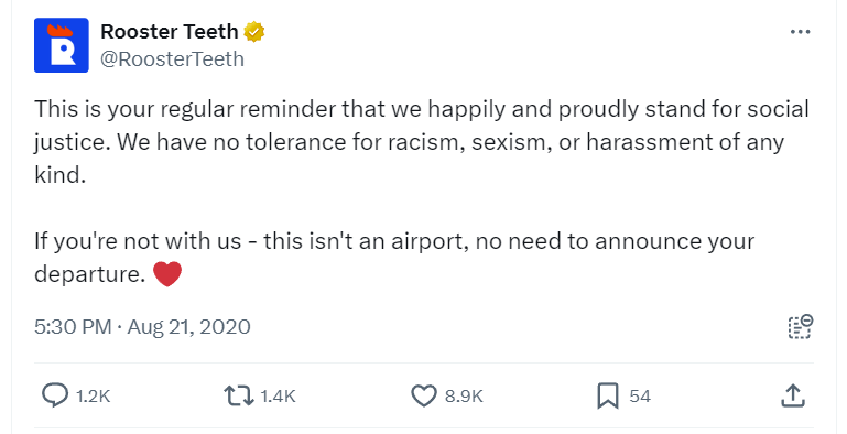 Back in August 2020, Rooster Teeth loudly broadcasts on Twitter, “This is your regular reminder that we happily and proudly stand for social justice. We have no tolerance for racism, sexism, or harassment of any kind.”