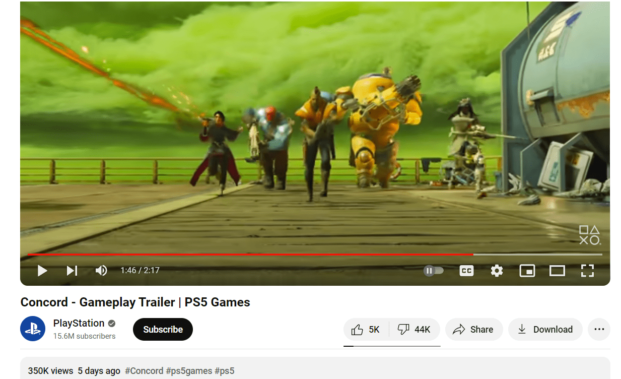 Screenshot of Concord’s Dislike to Like ratio via PlayStation YouTube
