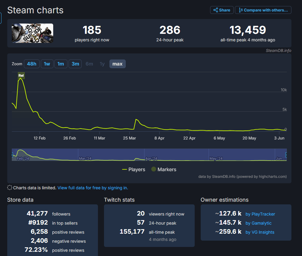 ‘Suicide Squad: Kill the Justice League’ Steam DB charts