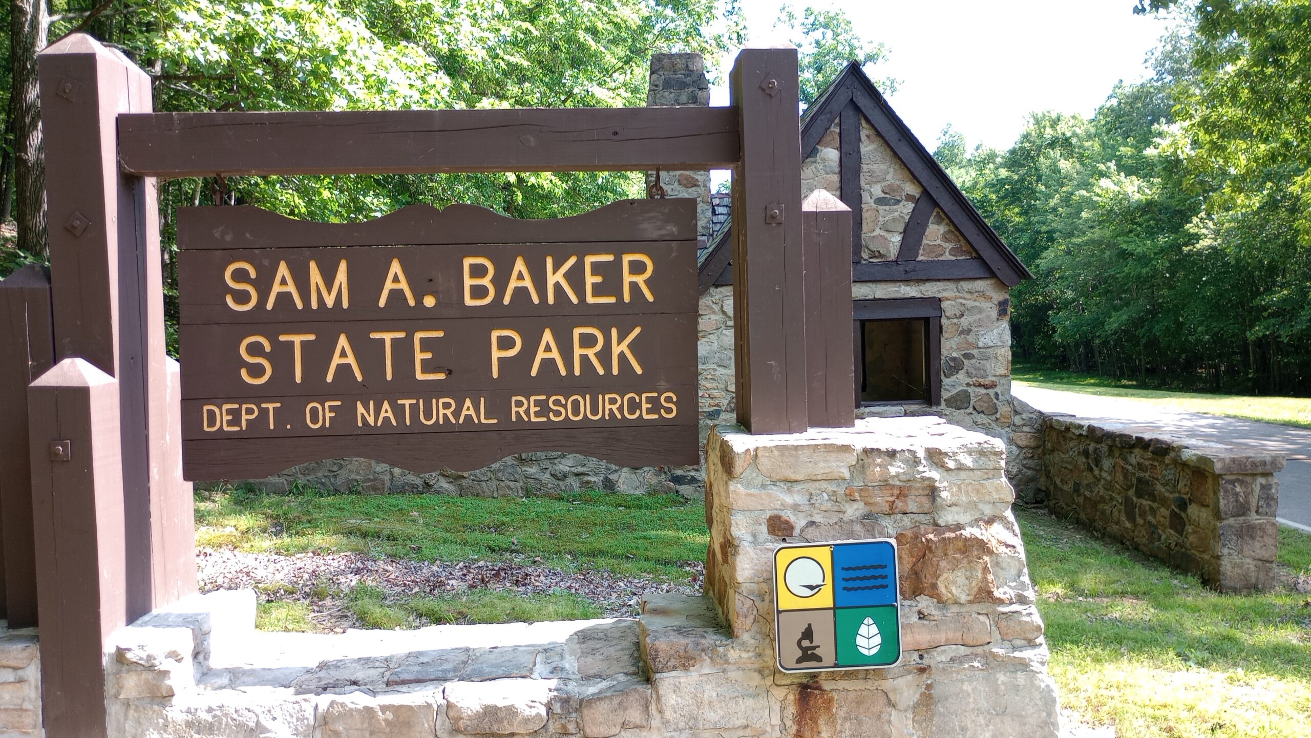 The many ways to explore and enjoy Sam A. Baker State Park is almost unlimited, but we chose an old-fashioned pursuit:hiking up and down Mudlick Mountain into a backcountry largely unchanged since the region’s early pioneer days to an isolated, rugged gorge called Mudlick Hollow. The Mudlick Trail begins at the nearly 100 year-old Civilian Conservation Corps built dining lodge constructed of native wood and stone, part of the nationally registered Sam A. Baker Historic District along with other structures like the 18 rustic cabins, visitor center, and 3 traditional hiking shelters complete with internal fireplaces for trail overnights in the Mudlick Mountain Wild and Natural Area; one of the largest wilderness preserves in the vast Missouri State Park system.