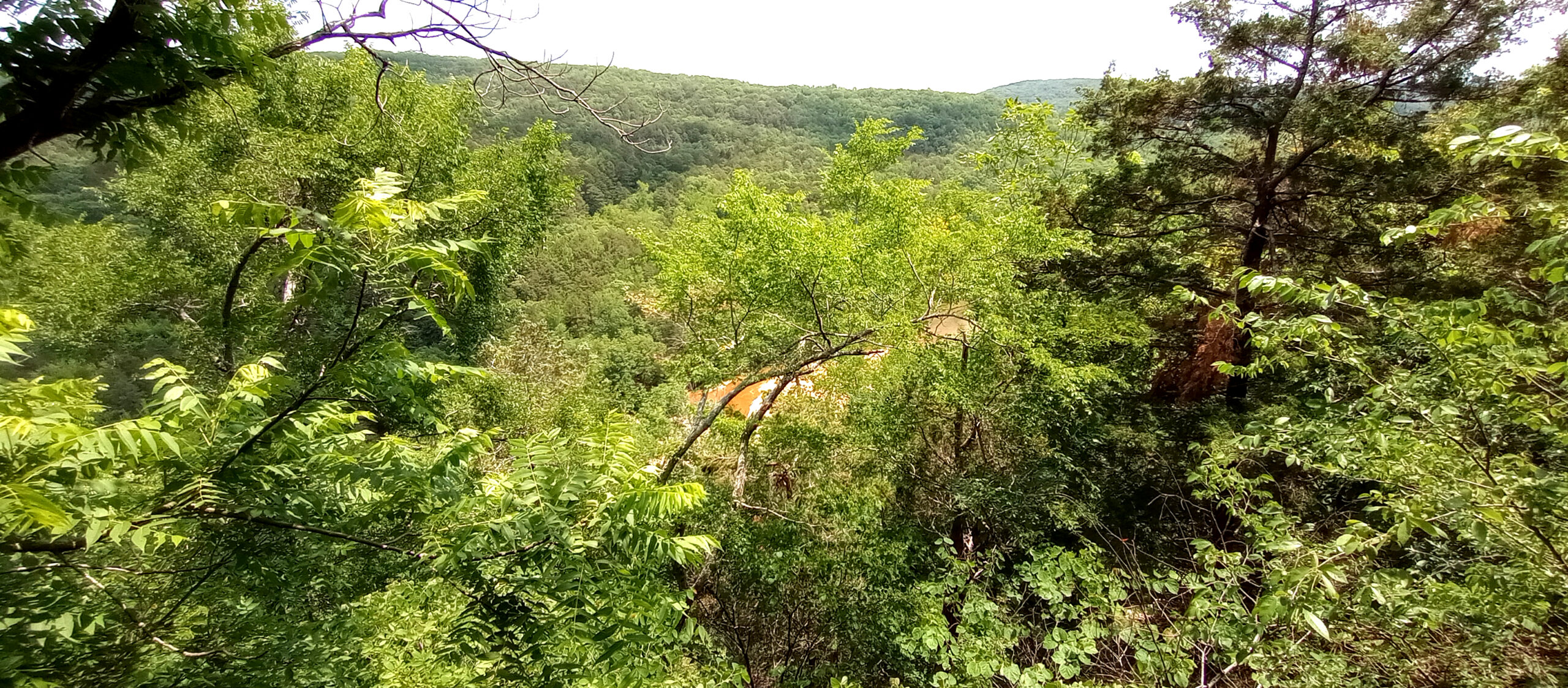 Descending into Mudlick Hollow past old growth oak and pine, the steep slope became forty plus degrees. The trail switchbacks in serpentine fashion as the footbed of small boulders to hop and slide across presents a challenge. Here up against the backside of the mountain, the trail traverses large open areas of talus slope rockslides. A turtle sat motionless directly on the trail listening to something in the far distance, head pointing towards the echoing sounds of New Country reverberating off the canyon of Big Creek from a floater’s raft slowly drifting by below.