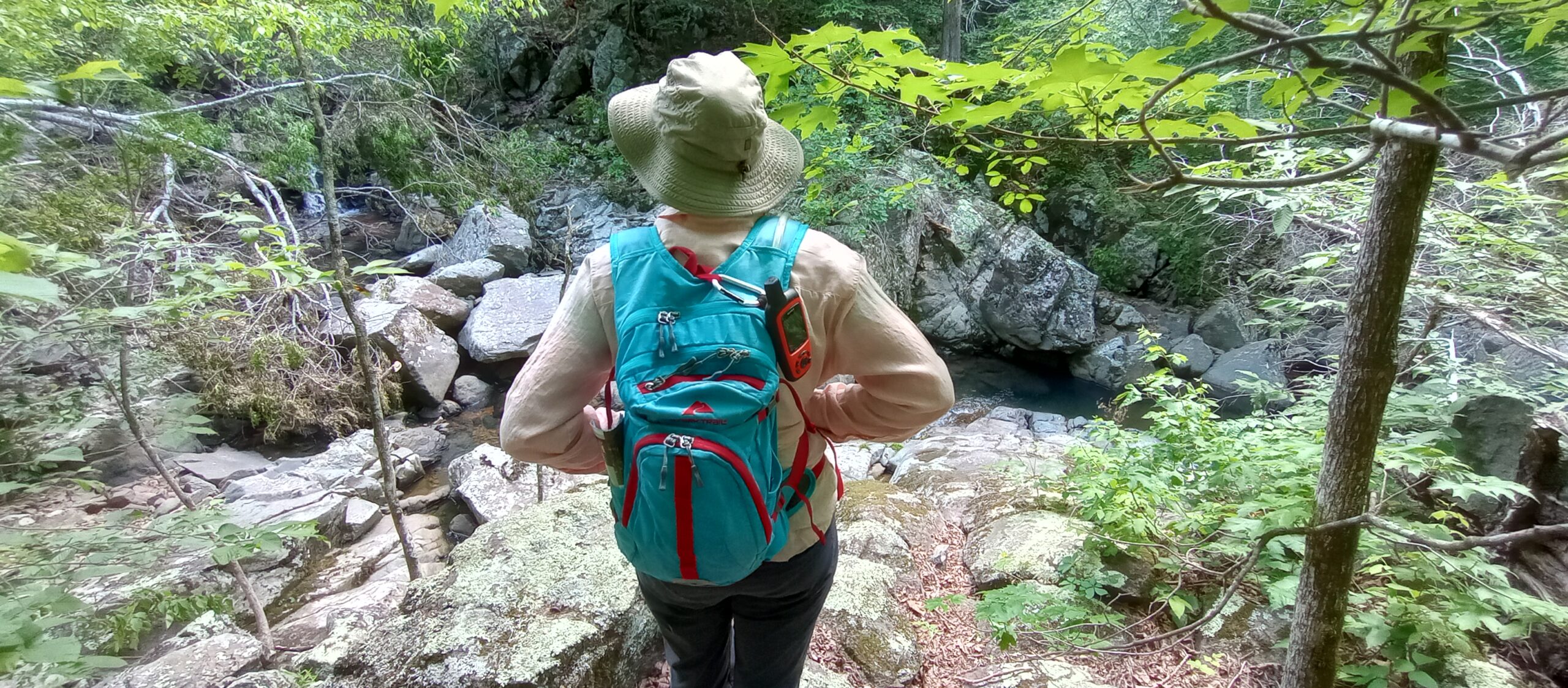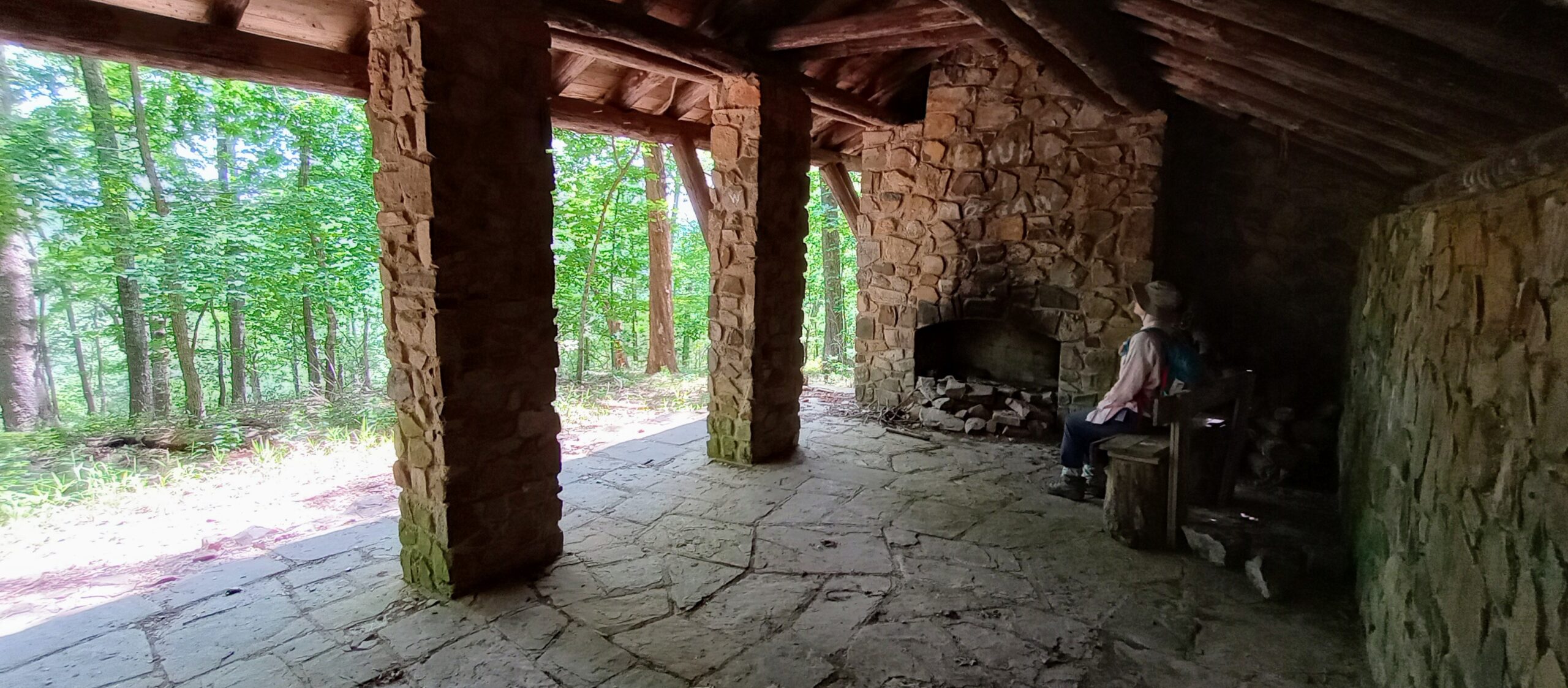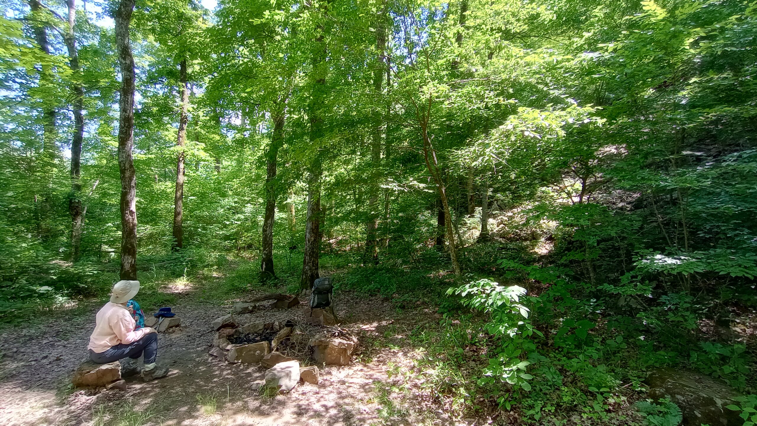 Near the historic stone C.C.C. backpack shelters overlooking Big Creek below, the woods are mixed with oak, hickory, black gum, and native pine. A huge Pileated woodpecker screeched as it flew past us in a streak of red, black and white. A fragrant breeze blew through the canopy above as the sound of birds chirping filled the sun-dappled dry woodlands. As if on cue, it was at Hiking Shelter 2 where we saw a bright blue Indigo bunting, a stunning migratory bird from South America at the northern limit of its expansive range, landing for a moment in a Shortleaf pine nearby.