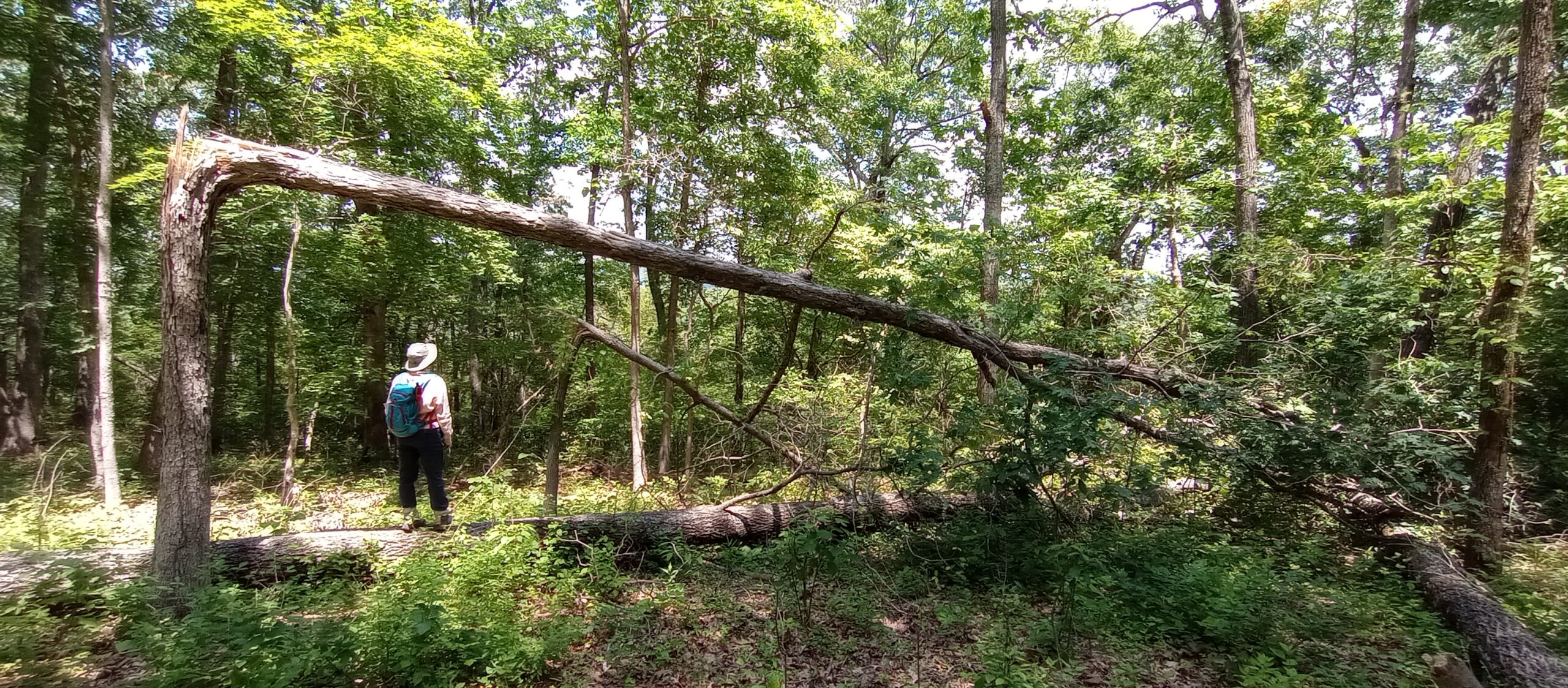 North America, making footing on the rough trail in places more difficult than hiking large parts of the Smokies or the Rockies. Several miles up onto the northern shoulder of Mudlick Mountain into the Wild and Natural area, the woods are thin, exposed to severe weather and natural fire for millennia; the forest has a distinct, harder-edged quality. Trees are seen twisted into unrecognizable shapes, found completely downed with roots exposed, or just plain snapped in half ten feet up their trunk from the tornadic winds that rip through the higher elevations of the Ozarks each year.