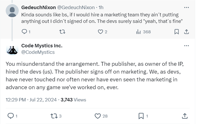 The company explained on X, “The publisher, as owner of the IP, hired the devs (us). The publisher signs off on marketing. We, as devs, have never touched nor often never have even seen the marketing in advance on any game we’ve worked on, ever.”
