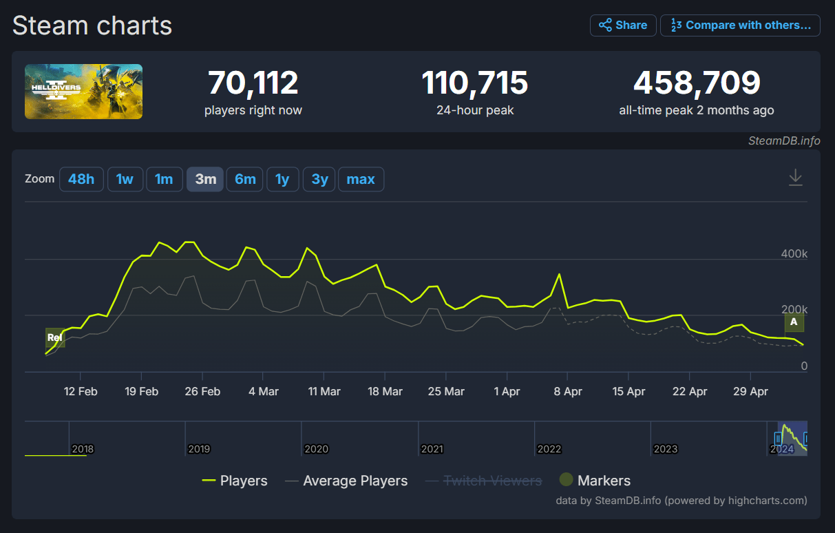 Helldivers 2 concurrent players data via Steam DB