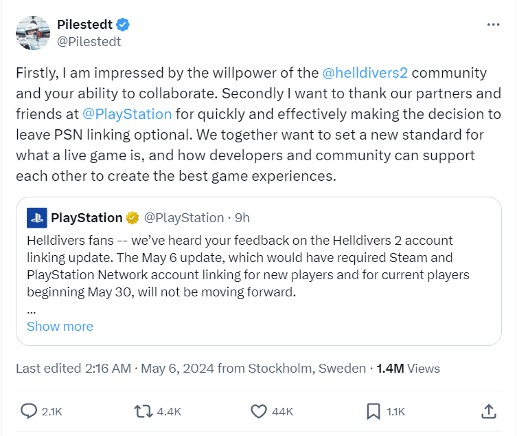 PlayStation posted an update on X at midnight on May 6th. It states, “Helldivers fans — we’ve heard your feedback on the Helldivers 2 account linking update. The May 6 update, which would have required Steam and PlayStation Network account linking for new players and for current players beginning May 30, will not be moving forward.”