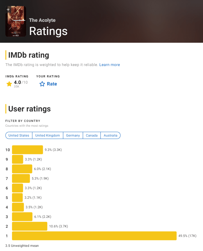 The score has now fallen to 4.0 out of 10 with the unweighted mean a 3.5 out of 10. Almost a majority of all reviews are a 1 out of 10 as well.