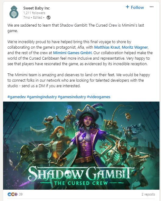 “The Mimimi team is amazing and deserves to land on their feet. We would be happy to connect folks in our network who are looking for talented developers with the studio – send us a DM if you are interested,” Sweet Baby Inc. concluded.