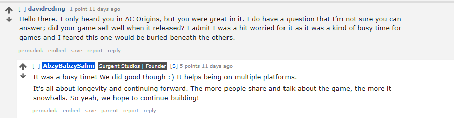 He posted on Reddit, “We did good though :) It helps being on multiple platforms. It’s all about longevity and continuing forward. The more people share and talk about the game, the more it snowballs. So yeah, we hope to continue building!”