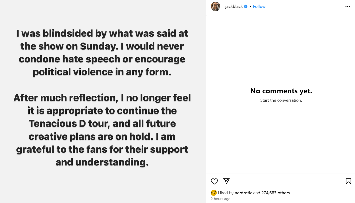 Black issued a statement on Instagram this morning announcing the end of Tenacious D’s tour and claiming he was blindsided by Gass’ actions. He wrote, “I was blindsided by what was said at the show on Sunday. I would never condone hate speech or encourage political violence in any form.”