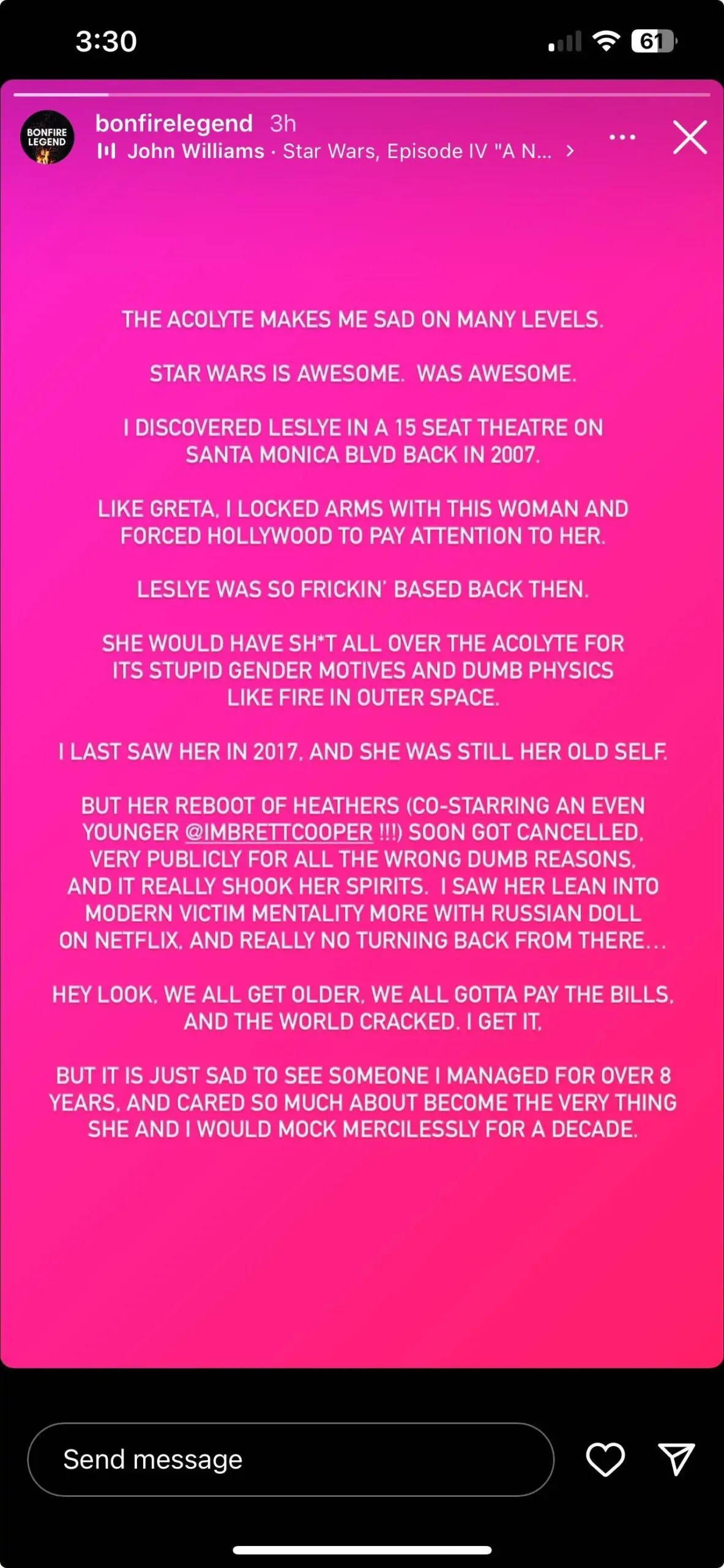 Sonnier wrote on Instagram, “The Acolyte makes me sad on many levels. Star Wars is awesome. Was awesome.”