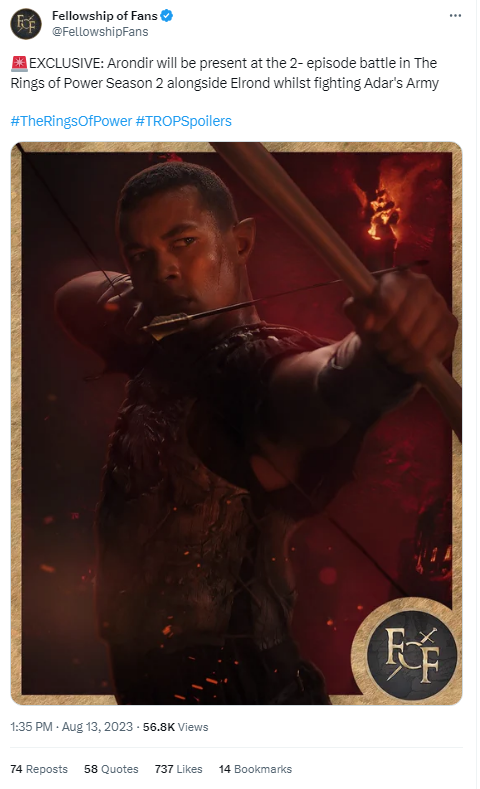 This piece of the rumor appears to confirm a previous rumor from Fellowship of Fans on X, who claimed back in August, ““Arondir will be present at the 2- episode battle in The Rings of Power Season 2 alongside Elrond whilst fighting Adar’s Army.