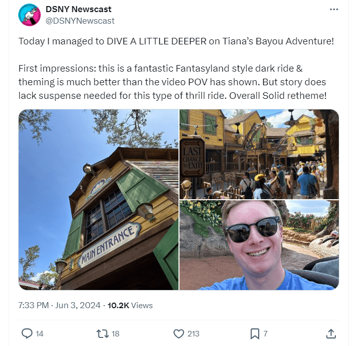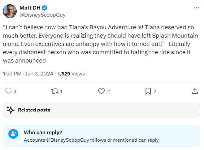 Disney Scoops defends Tiana’s Bayou Adventure with comments disabled.