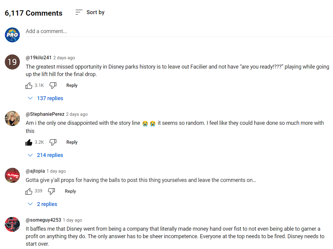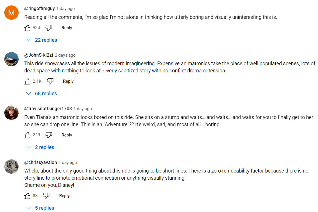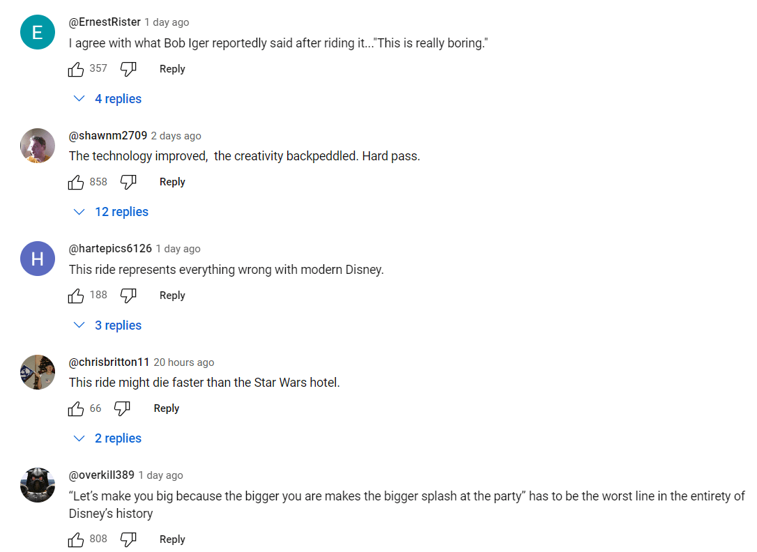 Thus it is that many are declaring this the worst ride redo in the history of Disney Parks, perhaps even eclipsing Journey into Imagination 2.0. Remember that Splash Mountain was the most-beloved attraction in the entire world when it was closed at both Disney World and Disneyland. This new attraction seems to somehow damaged Disney’s reputation in a way that we haven’t seen ever before. Just look at the scathing comments from the Disney Parks Official YouTube Channel:
