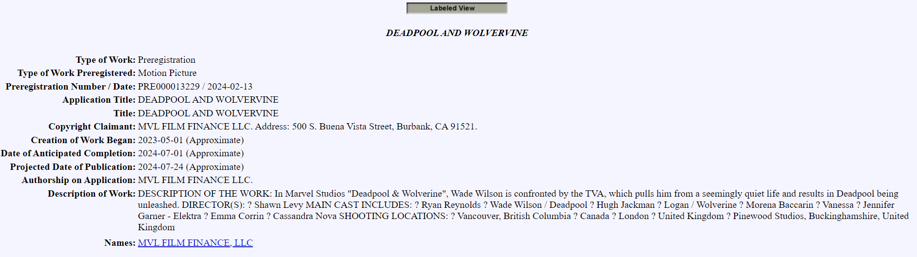 Deadpool and Wolverine entry from the U.S. Copyright Office Public Records