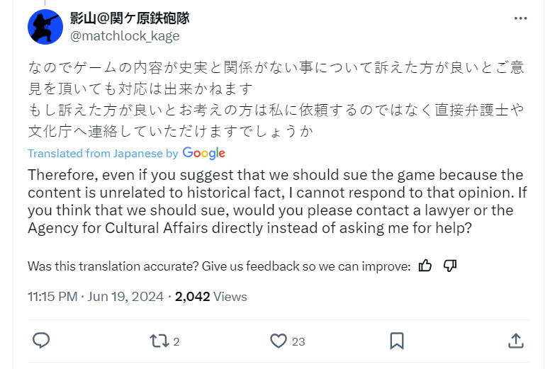 Next, he detailed that he contacted Ubisoft Japanese and informed them they should seek permission to use the back flag, “I registered as a user and contacted Ubisoft’s Japan support via inquiry form. I told them that the concept art depicts the ‘Sekigahara rifle corps’ flag’ and that if they wanted to officially use it, they should contact the representative.”