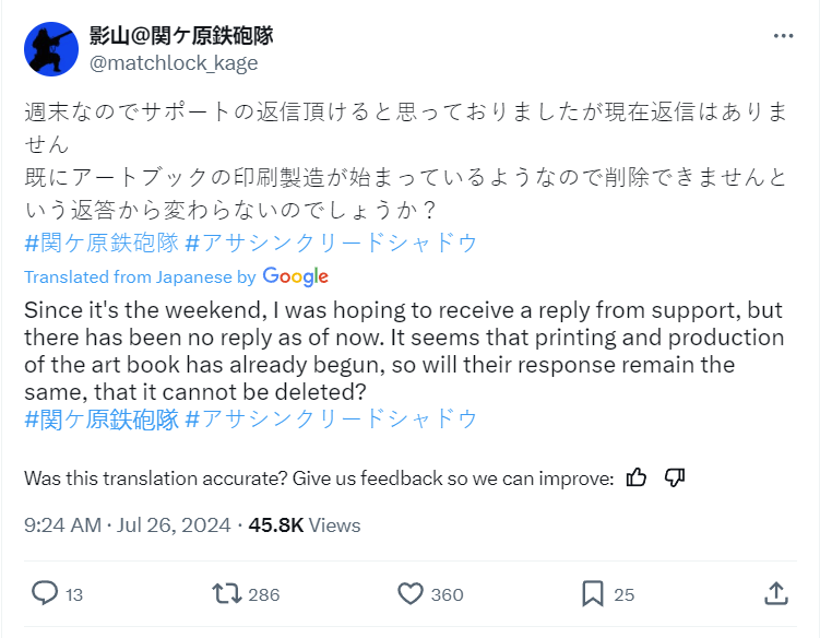In a follow-up on July 29th, he revealed Ubisoft refused to remove the flag from the art book, “I received a message from UBIsoft support today. The details are as follows: I printed it out so I can’t delete it now. It’s difficult to make out the text from the image. The image has been deleted from the system managed by UBIsoft. I’m sorry I couldn’t meet your request. In bullet points, that’s what happened.”