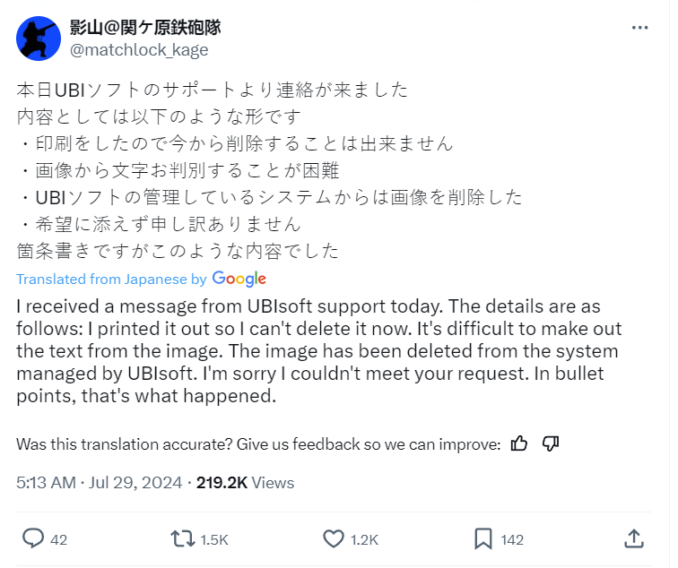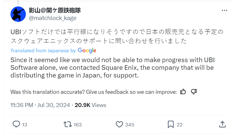 He wrote on X, “Since it seemed like we would not be able to make progress with UBI Software alone, we contacted Square Enix, the company that will be distributing the game in Japan, for support.”