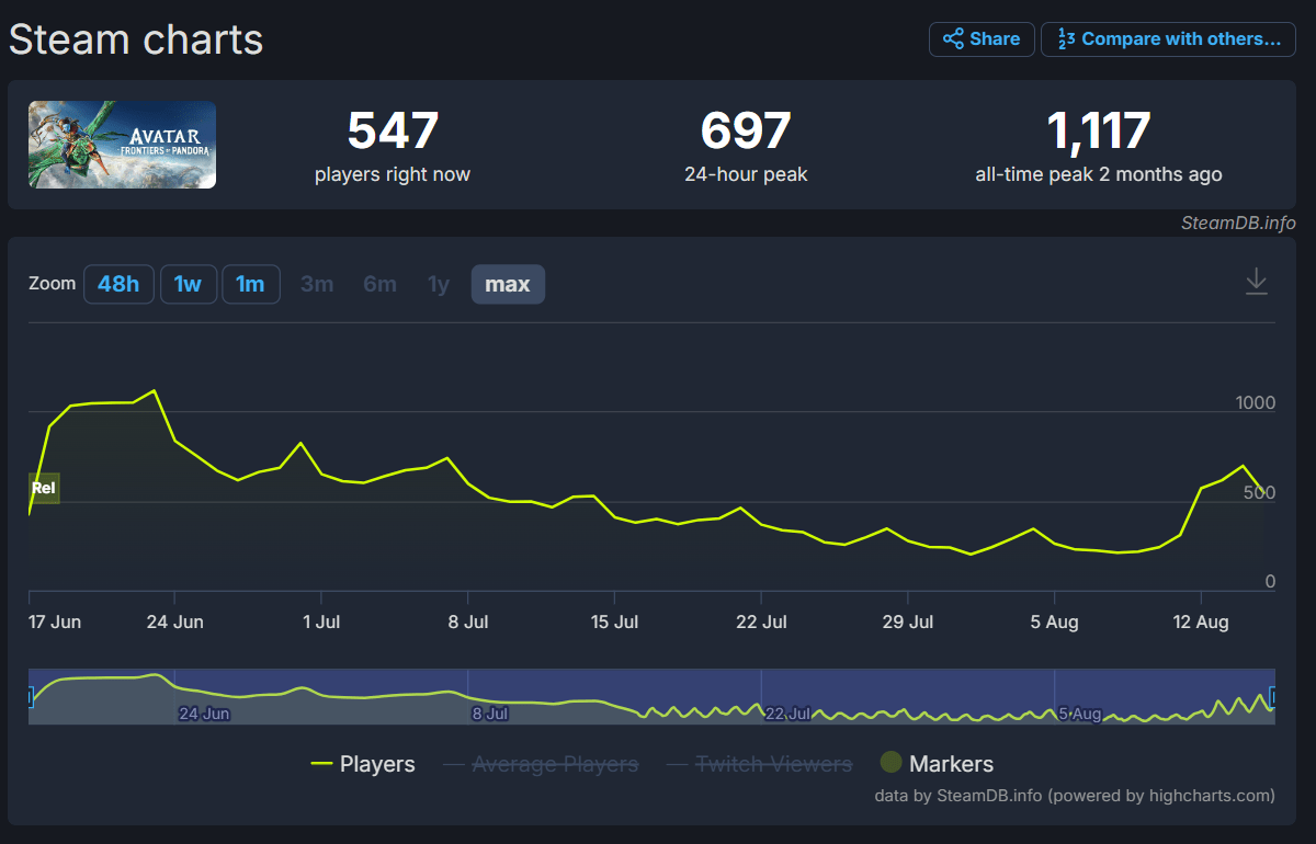 Avatar: Frontiers of Pandora Steam charts via SteamDB