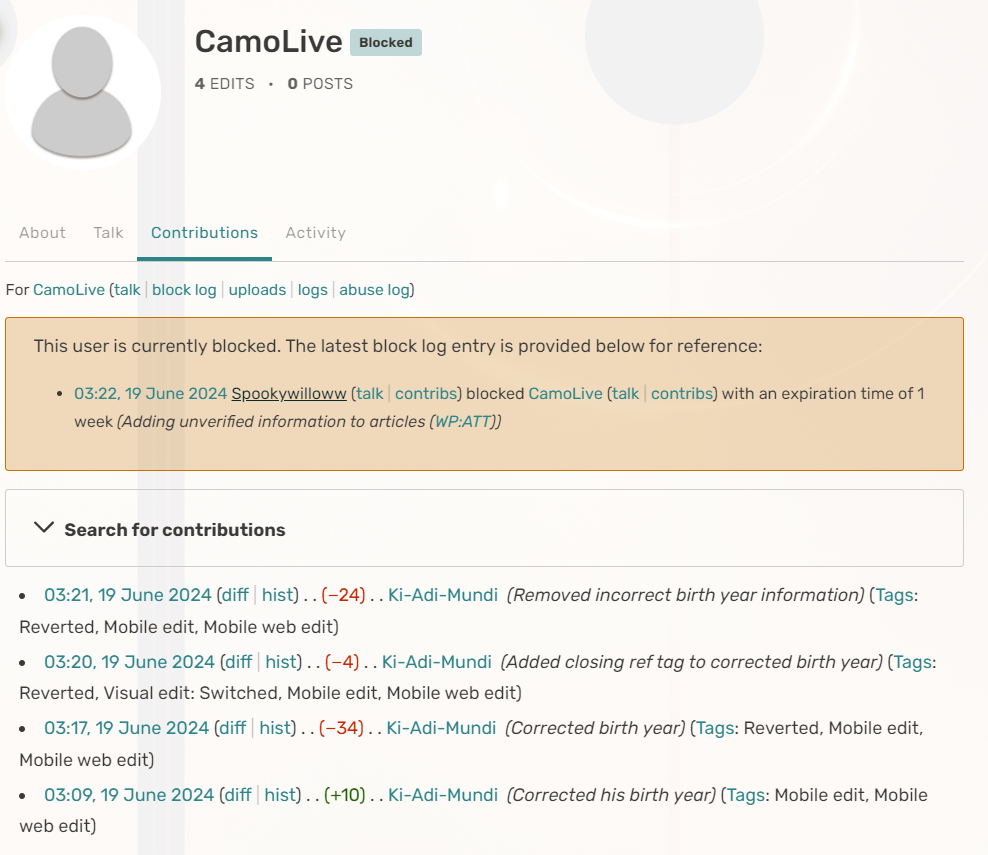 One such editor was CamoLive. An explanation for why this person was blocked was given by user Spookywilloww who claimed CamoLive was “adding unverified information to articles.” Ironically, as noted the Legends entry does indeed cite the Star Wars Episode I Insider’s Guide as a source for Mundi’s birth year of 93 BBY.