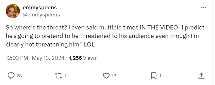 Speens replied, “So where’s the threat? I even said multiple times IN THE VIDEO ‘I predict he’s going to pretend to be threatened to his audience even though I’m clearly not threatening him.’ LOL.”