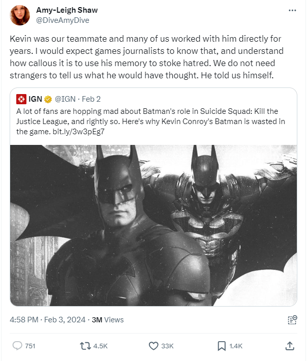 Amy-Leigh Shaw, who worked on Suicide Squad: Kill The Justice League, attempted to defend the game from criticism from IGN that lampooned the game for wasting Kevin Conroy’s Batman.